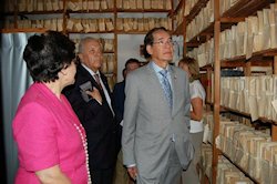 Desde por la mañana, los embajadores, alojados en el Hotel Casa Arizón, recorrieron las calles de Sanlúcar camino del Palacio de los Duques de Medina Sidonia donde la Presidenta del Patronato de la Fundación Medina Sidonia, Lilian Dalhmann, los recibía con palabras de bienvenida. Esa visita les introdujo en el mundo antiguo que contiene el archivo del Palacio Ducal, legado patrimonial y monumental incomparable y con toda probabilidad, único en España por su valor documental y su carácter privado. Allí pudieron consultar y palpar los señores embajadores códices, legajos, cartas reales, privilegios y también, la explicación de mucho de la historia de España y de porqué Sanlúcar fue lo que fue durante el siglo de oro español. Hay que hacer constar que entre esos muros se encuentran documentos desde 1.159, siglo XII. Acompañaban al embajador de Filipinas el cónsul general de Filipinas en Andalucía, D. José J. Bidón y Vigil de Quiñones y el cónsul en Cádiz, D. Fernando J. Blanco, además de una comitiva formada por miembros directivos de las entidades organizadoras.