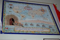 Una vez acabada la misa, toda la comitiva, en la que ya se habían incluido autoridades civiles y militares se dirigieron a la calle Isaac Peral para el descubrimiento de un azulejo en la fachada de la Biblioteca Municipal, y que viene a representar el camino de esta primera circunnavegación y que lógicamente estaba especialmente dedicado a los dos países citados, azulejo obra del artesano sanluqueño Manolo Gallego.
