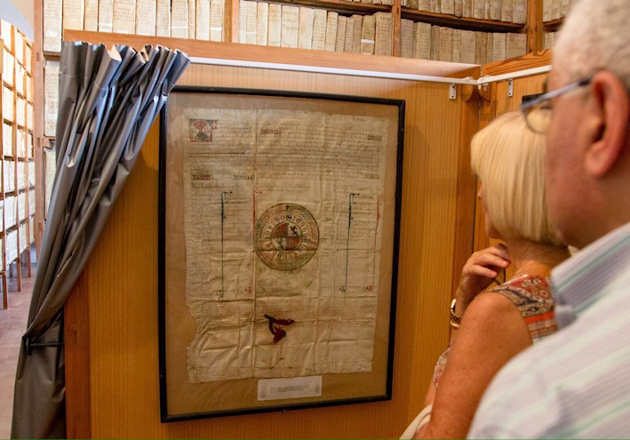 Más tarde la comitiva se dirigió al Palacio Ducal donde se realizó una visita guiada a dicho palacio, haciendo especial hincapié en su Archivo que es sin duda uno de los más importantes de Europa por la cantidad e importancia de documentos que contiene.