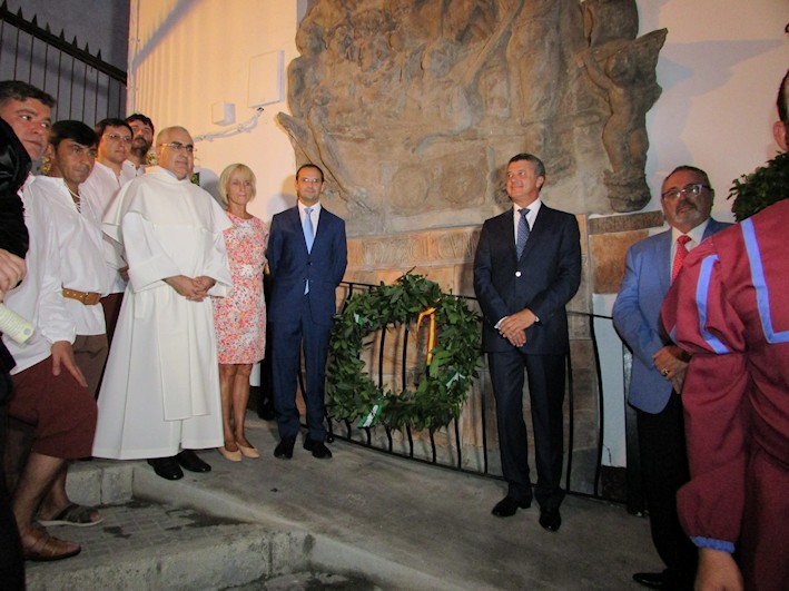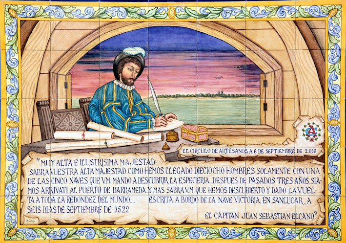 Por la Cuesta de Belén bajaron hasta la calle Isaac Peral donde en la fachada de la Biblioteca Pública se inauguró un azulejo conmemorativo de la carta que Juan Sebastián Elcano dirigió al Emperador Carlos desde la nao Victoria anclada en aguas de Sanlúcar de Barrameda tras haber vuelto de su periplo mundial. El azulejo es obra del ceramista sanluqueño Manuel Gallego.